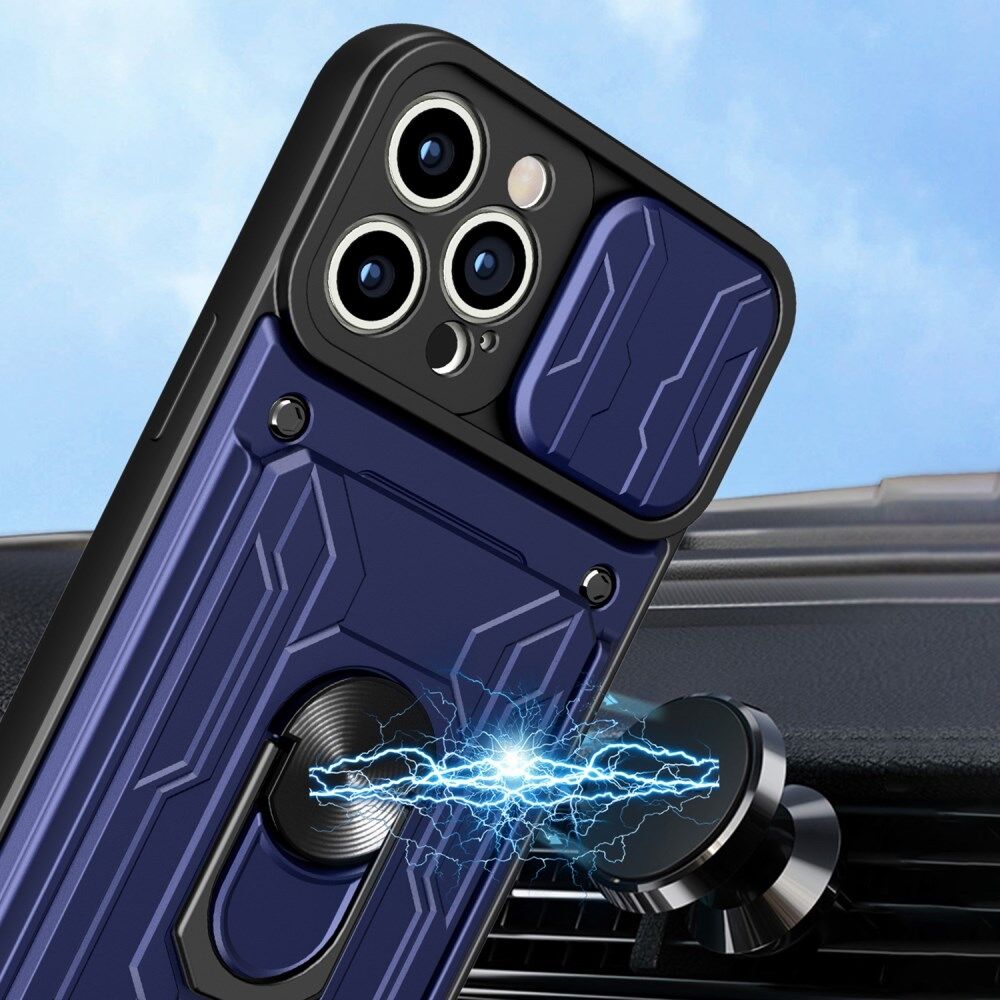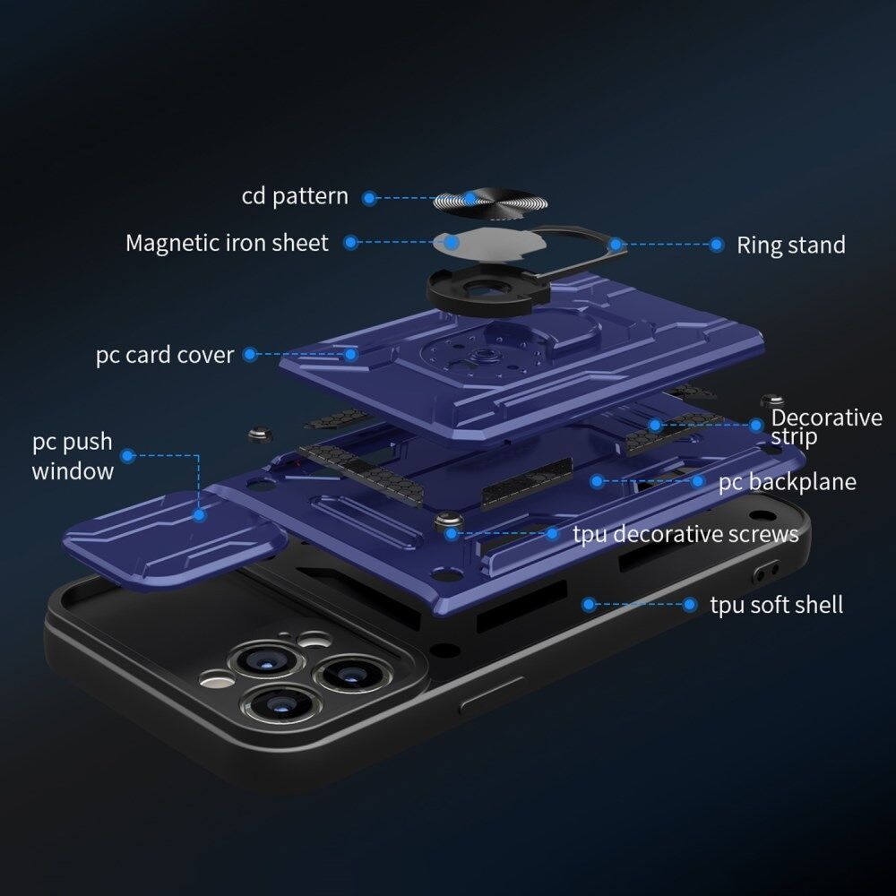 Afneembare kaartsleuf Harde pc + zachte TPU-telefoonhoes Kickstand Hybride hoes met cameraschuifhoes voor iPhone 13 Pro - titaniumgrijs