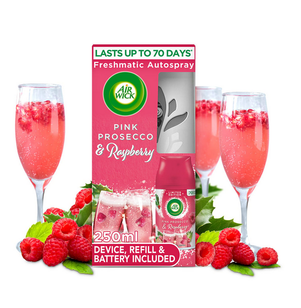 Air Wick Freshmatic Spray met Navulling - Roze Prosecco & Framboos Air Wick Freshmatic Spray met navulling houdt de kamers in huis en op kantoor fris en geurig.