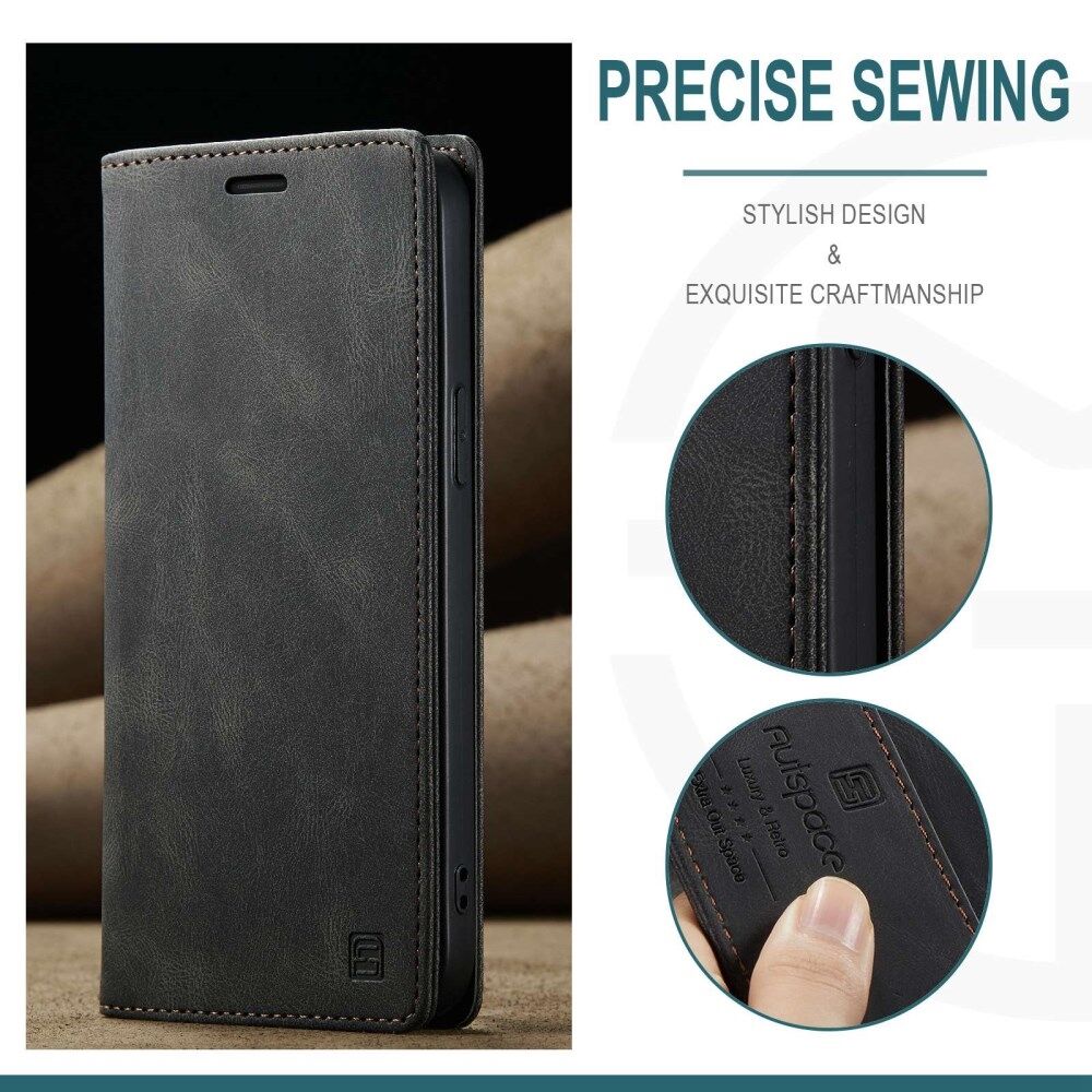 AUTSPACE A01-serie voor iPhone 14 Pro 6.1 inch retro mat PU-leer mobiele telefoon anti-drop case RFID-blokkering flip- Stand portemonnee cover - zwart