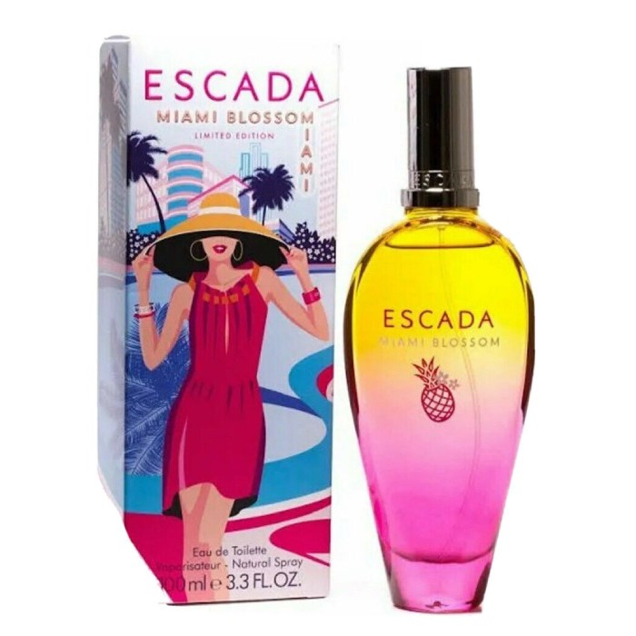 Miami Blossom van Escada is een bloemige fruitige geur voor vrouwen, geïntroduceerd in 2019. Het bevat watermeloen, bosbessen, sinaasappel, ananas, tiare-bloem, jasmijn, tuberoos, ambroxan, muskus en sandelhout.