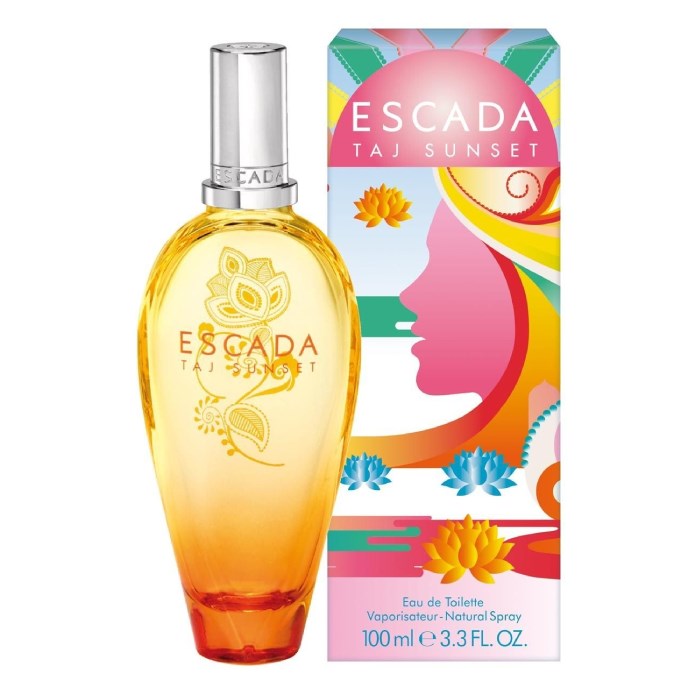 Taj Sunset van Escada is een bloemige fruitige geur voor vrouwen, uitgebracht in 2011. Het combineert mango, nectarine, bloed sinaasappel, framboos, sterappel, waterlelie, lotus, kokos, muskus en sandelhout.