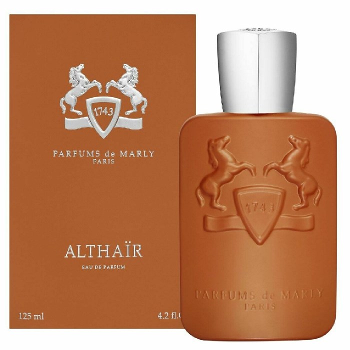 Althaïr van Parfums de Marly is een amber vanille geur voor mannen. Dit is een nieuwe geur. Gelanceerd in 2023. Gemaakt door Hamid Merati-Kashani en Ilias Ermenidis. Topnoten: kaneel, kardemom, sinaasappelbloesem en bergamot; hartnoten: bourbon vanille en elemi; basisnoten: praliné, musk, ambroxan en guaiac hout.