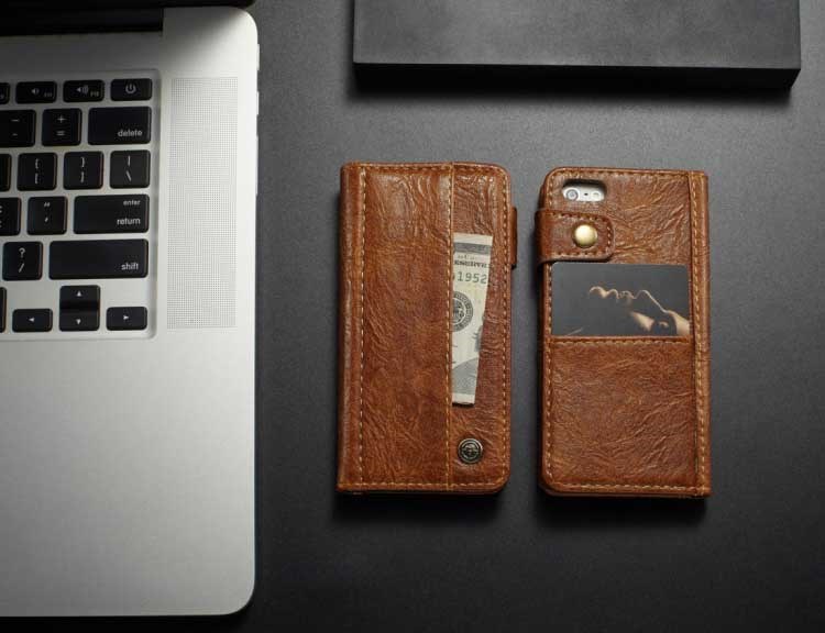 Een mooi CaseMe-ontwerp met ruimte voor briefgeld, kaarthouder aan de binnen- en achterkant en magnetische sluiting voor je iPhone.