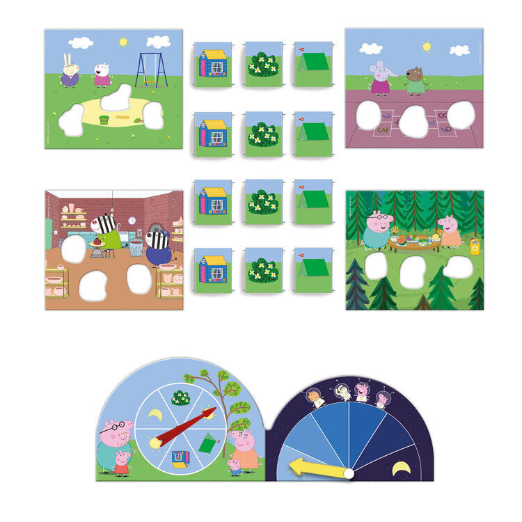 • Een coöperatief spel waarbij kinderen samen voor het donker opstaan om te ontdekken waar Peppa en haar vrienden zich hebben verstopt! • Kinderen spelen verstoppertje met Peppa en haar vriendjes, vinden hun schuilplaats en brengen ze terug naar mama en papa voordat het donker wordt. • Het spel bevat 4 kaarten, elk met 3 karakters om te spelen in de vorm die bij hen past, 12 kartonnen dozen om te gebruiken als schuilplaatsen, een dobbelsteen en een timer. • Haal de 12 karakters uit de kartonnen kaartjes en berg ze op verschillende plekken op. Kinderen gooien om de beurt met de dobbelstenen, openen de dozen op basis van het resultaat en pakken het personage. • Het doel van het spel zijn alle karakters op de overeenkomstige kaart voordat de timer eindigt op de maan (het begin van de nacht).