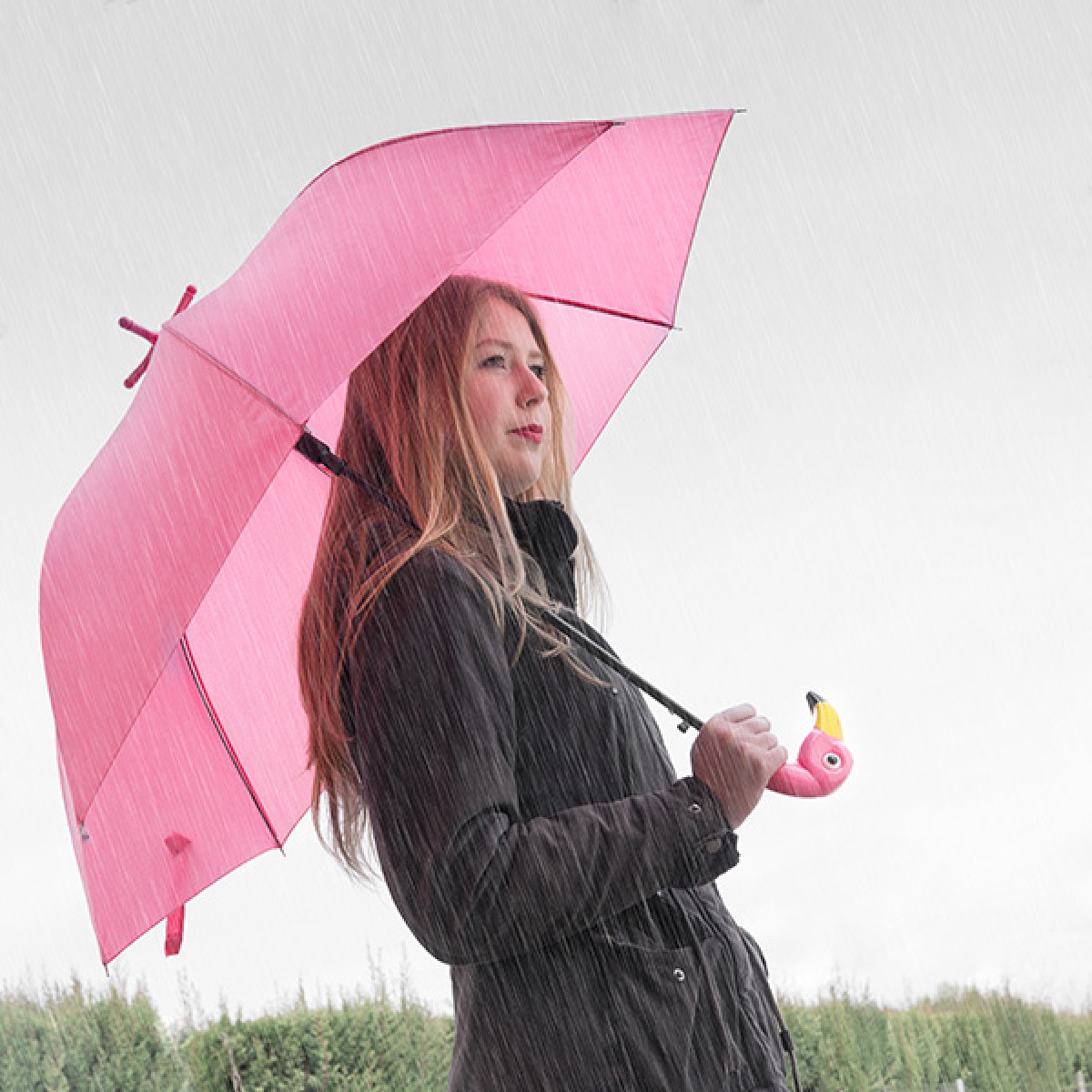 De paraplu heeft de vorm van een flamingo, die op zichzelf kan staan omdat hij is voorzien van een voet.