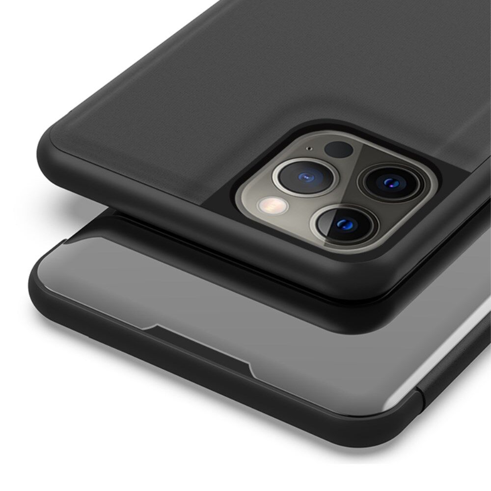 Galvaniseren Spiegelend Oppervlak Leren Telefoon Case Stand Shell met Venster voor iPhone 13 Pro - Donkerblauw