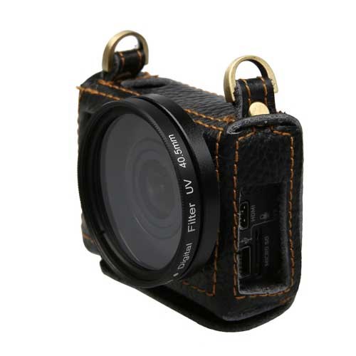 De tas sluit met drukknopen aan de onderkant om de camera en heeft openingen voor alle cameraknoppen en functies om de camera te bedienen zonder hem eruit te halen. Een zonnekap wordt meegeleverd.