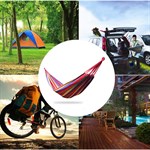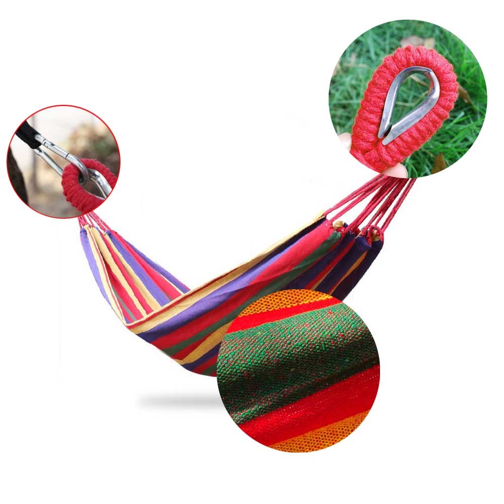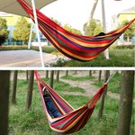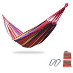 Mooie regenboogkleurige hangmat die makkelijk mee te nemen is in de meegeleverde tas.
