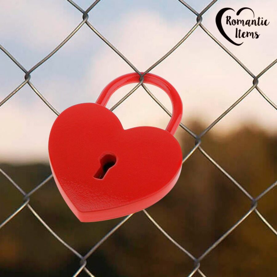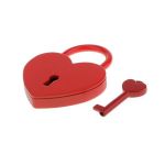 Prachtig hangslot in de vorm van een rood hart met een bijbehorende hartsleutel.