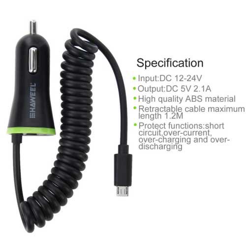 HAWEEL 5V 2.1A Micro USB autolader 25cm-120cm