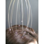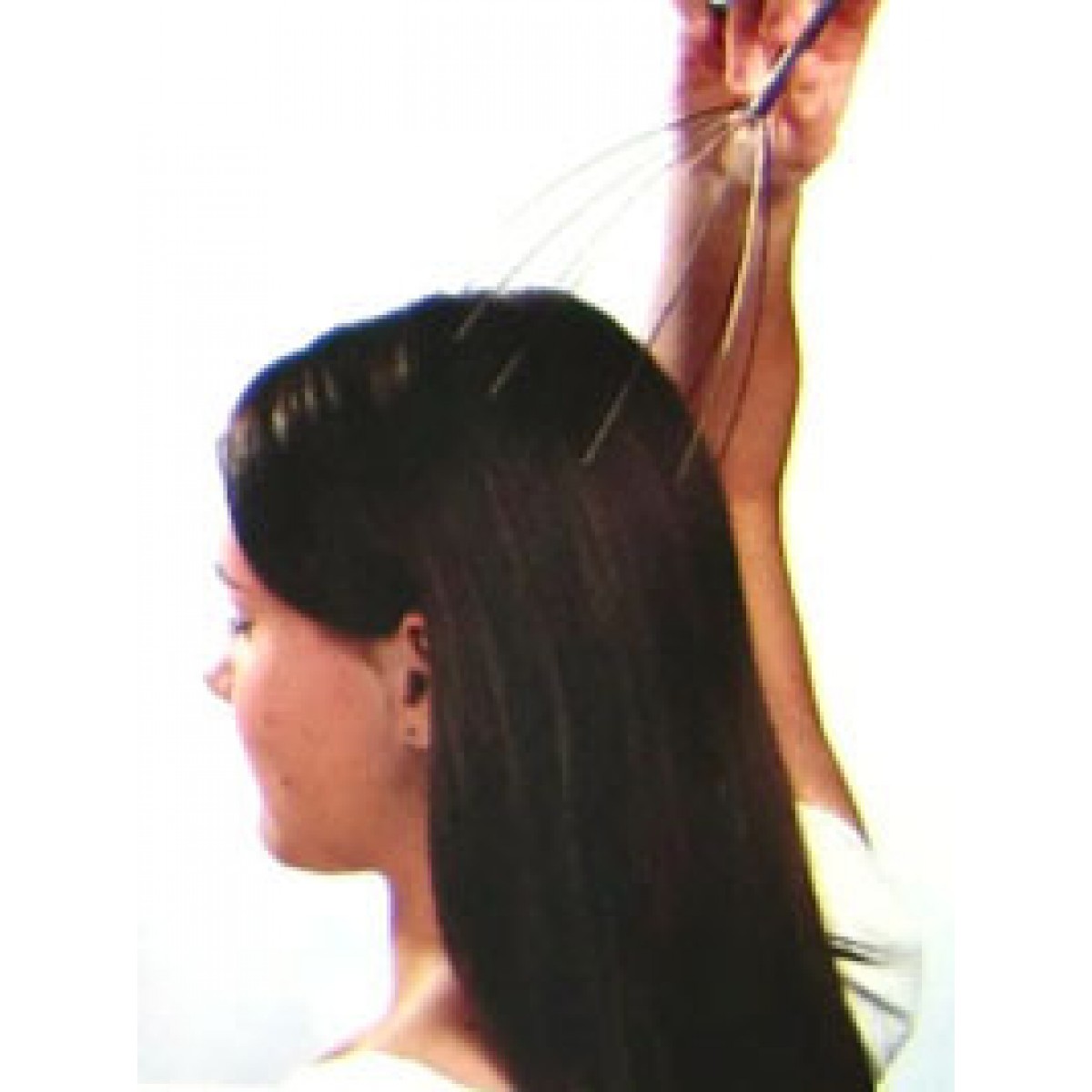 Een ontwerp in metaal met 12 lange poten met plastic speldenkoppen om de zenuwen in de hoofdhuid te stimuleren.