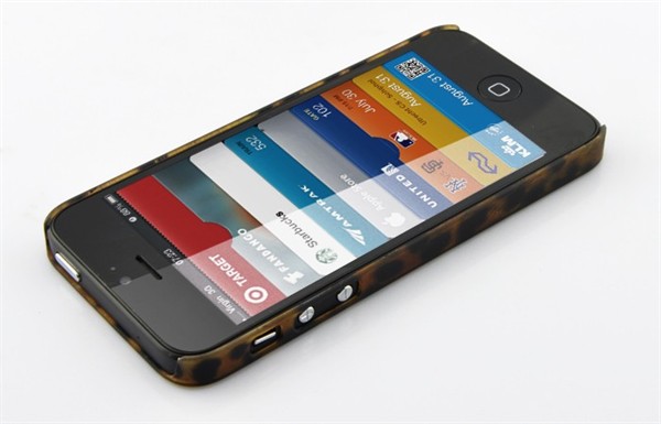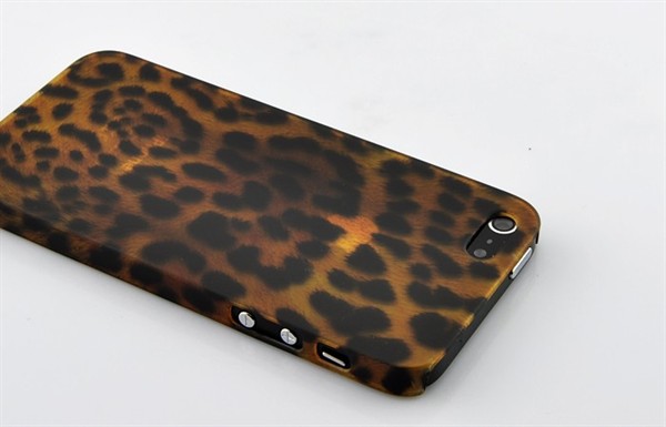Stoere iPhone 5 kunststof hoes, iets transparant met een luipaardpatroon met een oranje tint.