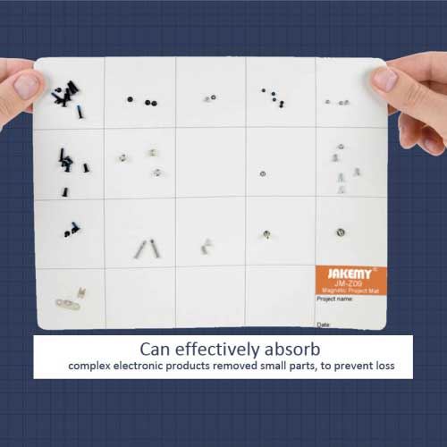 De mat heeft een magnetisch oppervlak dat o.a. kan kleine schroeven en onderdelen vasthouden tijdens reparaties aan elektrische apparaten.
