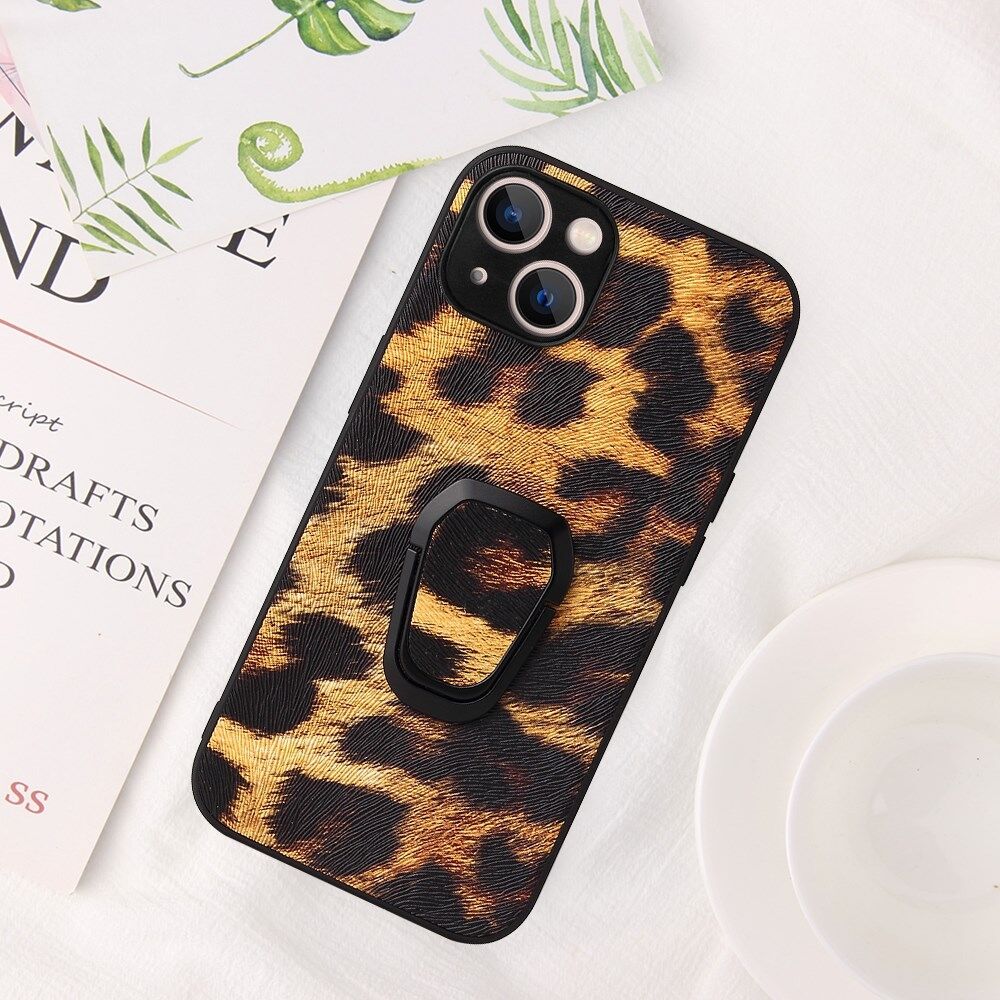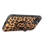 Kickstand-ontwerp PU-leer gecoate telefoonhoes Shell met ingebouwde metalen plaat voor iPhone 13 - luipaardtextuur/geel