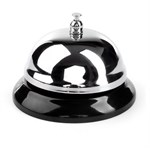 De tafelklok is uitsluitend gemaakt van metaal met een zwarte voet en glanzende zilveren bel.