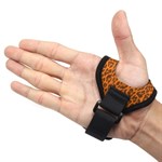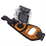 De band is gemaakt van zacht neopreen en is oranje met een luipaardpatroon.