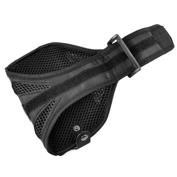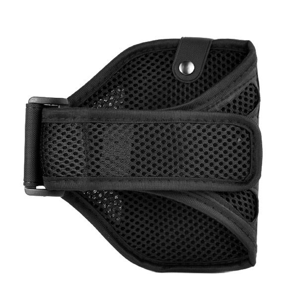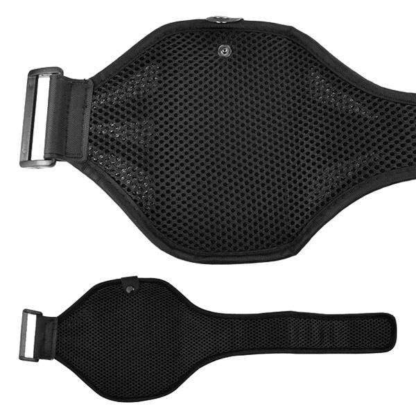 De armband is gemaakt van plastic en mesh materiaal met een klittenbandsluiting en heeft een gaatje om je koptelefoon aan te sluiten.