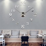 De klok meet maximaal 120 x 120 cm maar de lengte kun je zelf bepalen en is voorzien van zilverkleurige cijfers.
