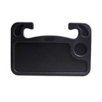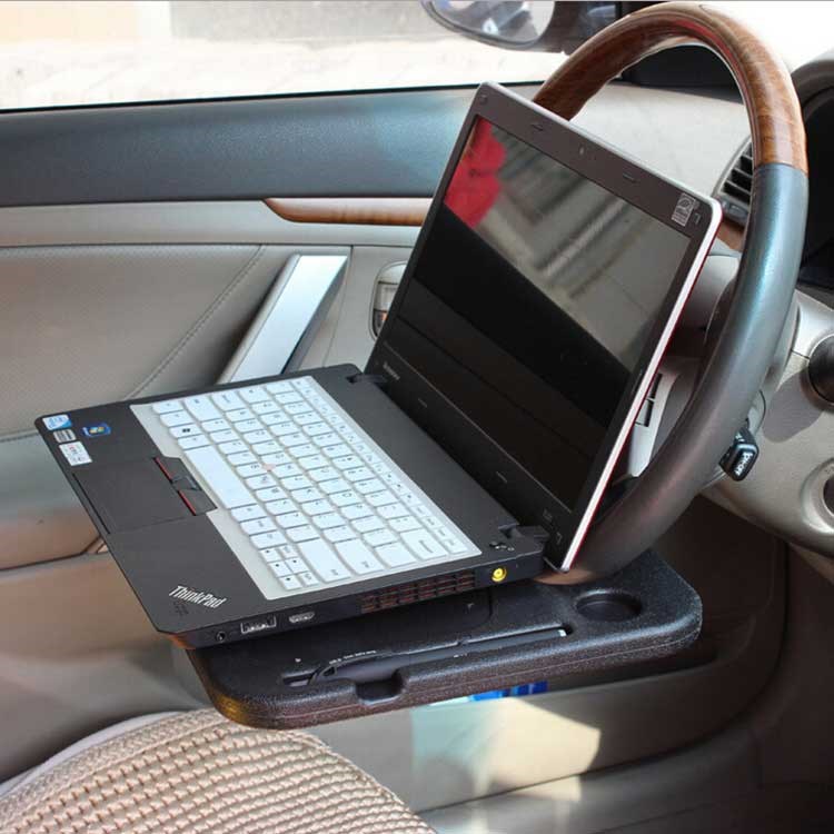 Het dienblad is eenvoudig te bevestigen aan het stuur van de auto en je kunt de hoek en hoogte aanpassen aan de positie die je wilt voor je monitor en toetsenbord. Een functioneel ontwerp met ruimte voor je beker of fles en die gebruikt wordt voor je lunch in de auto.