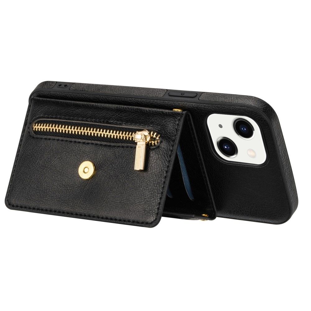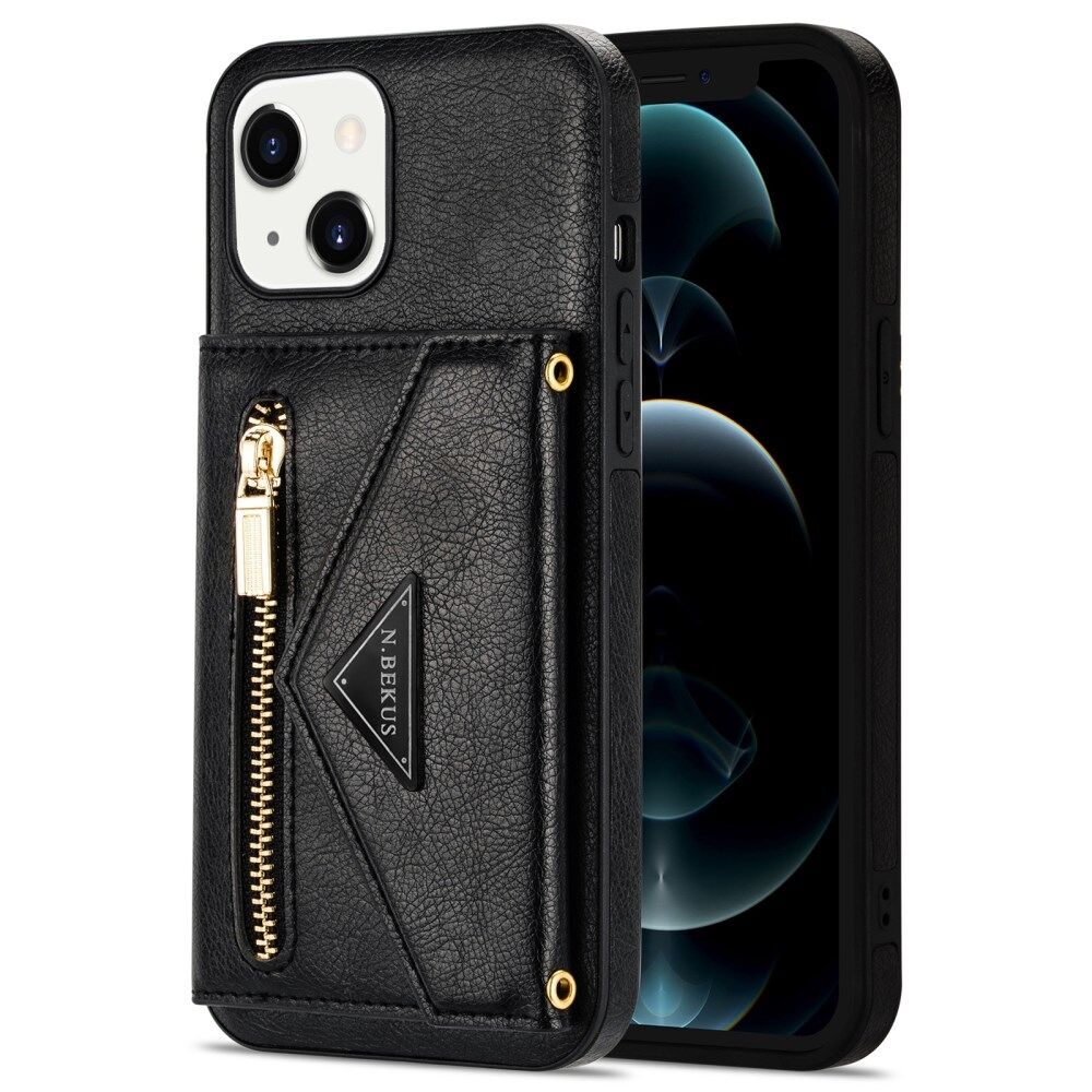 N.BEKUS voor iPhone 13 6.1 inch lang lanyard anti-val portemonnee PU-leer + TPU mobiele telefoonhoes met standaard - zwart
