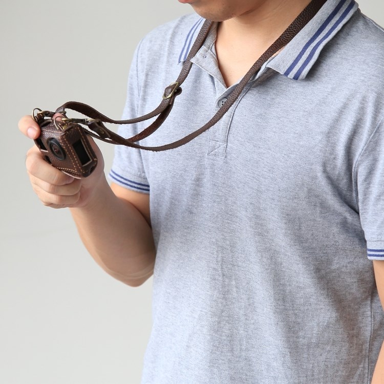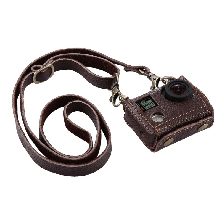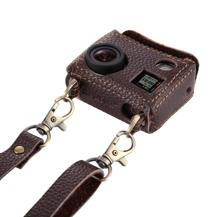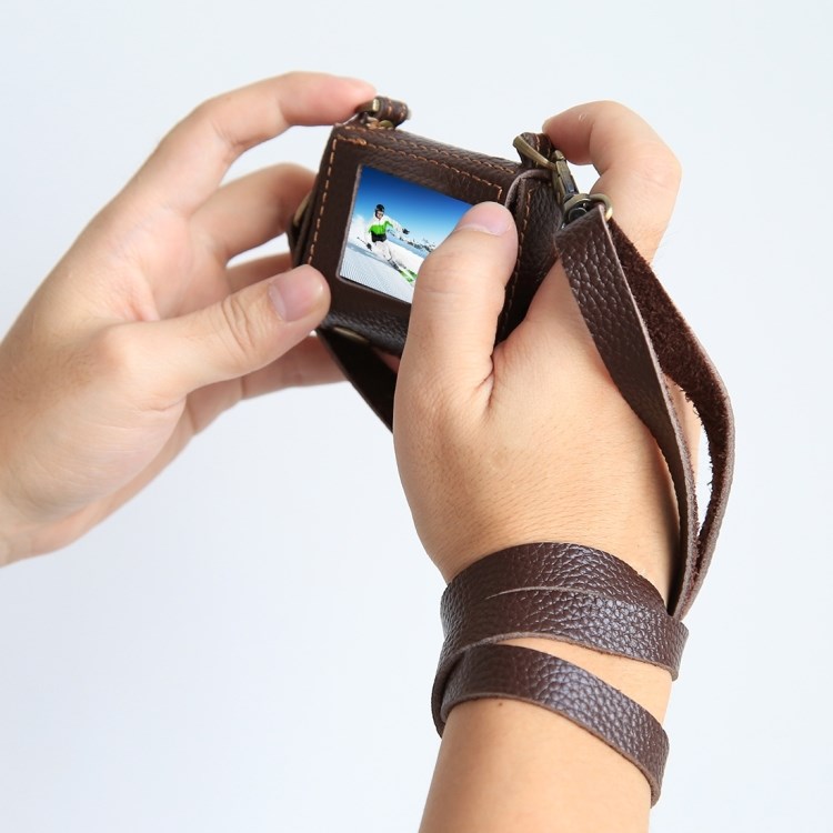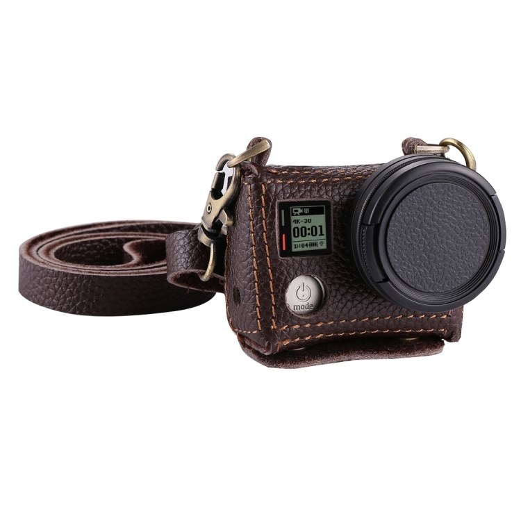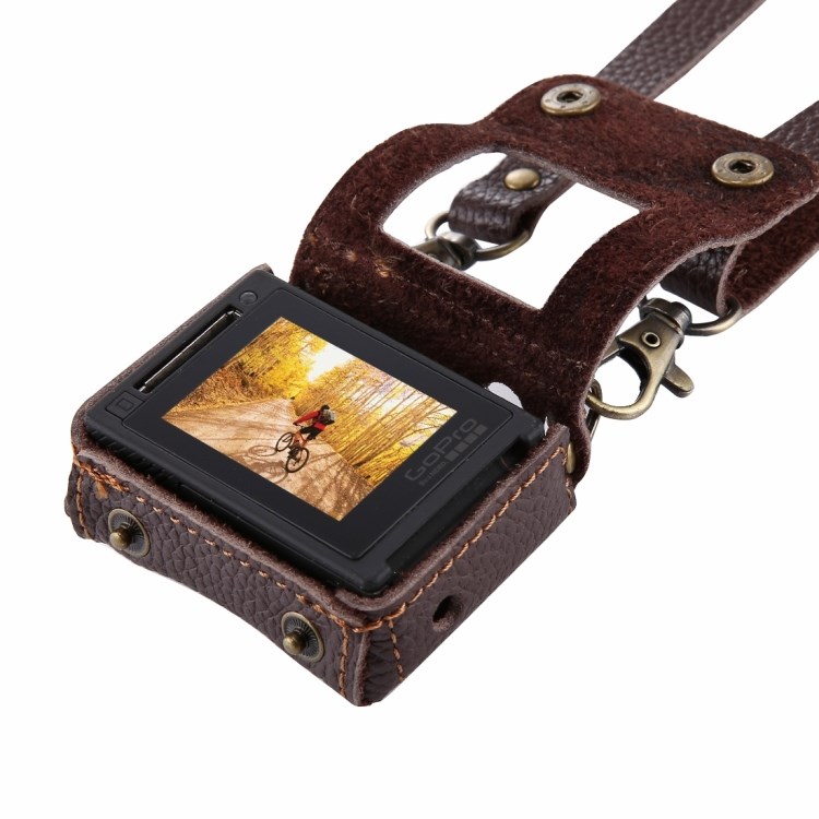 Leren tas voor GoPro HERO4. Een beschermende cameratas met nekriem. Een mooi afgewerkt ontwerp in echt rundleer met externe stiksels en mooie details voor GoPro HERO4.