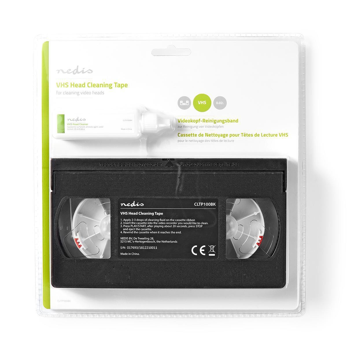 Deze Nedis® VHS reinigingstape zorgt ervoor dat je speler optimaal werkt en langer meegaat. Het is belangrijk om uw VHS-koppen schoon te houden voor helder beeld en geluid. De 20 ml fles hoogwaardige reinigingsvloeistof is een veilige en effectieve manier om te blijven genieten van uw films.