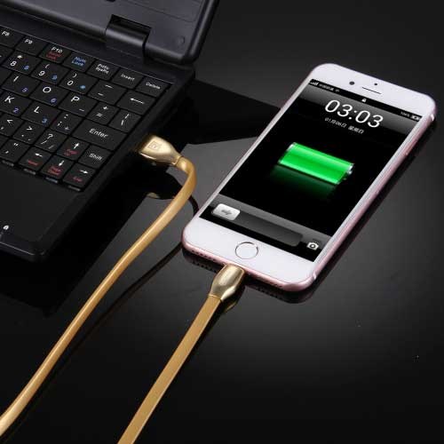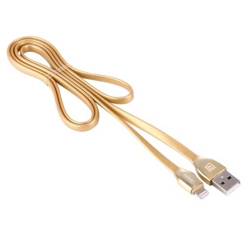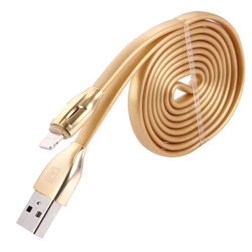 Remax Lightning-USB-kabel voor opladen en synchroniseren met LED-indicator voor iPhone, iPod en iPad. Een unieke vergulde kabel in slanglook met koperdraad en connector in aluminium. De platte Lightning-kabel zorgt voor supersnelle gegevensoverdracht en opladen voor al je Apple-producten.