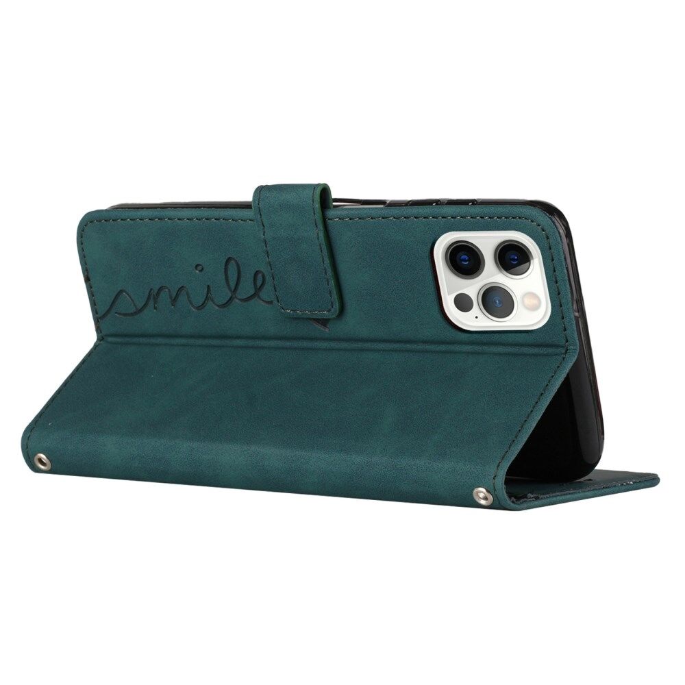 Skin-touch Feeling Case voor iPhone 14 Pro, hartvorm bedrukte portemonnee Stand PU lederen telefoonhoes met schouderriem - groen