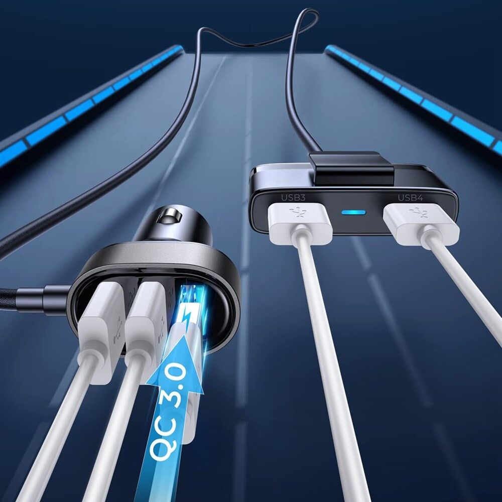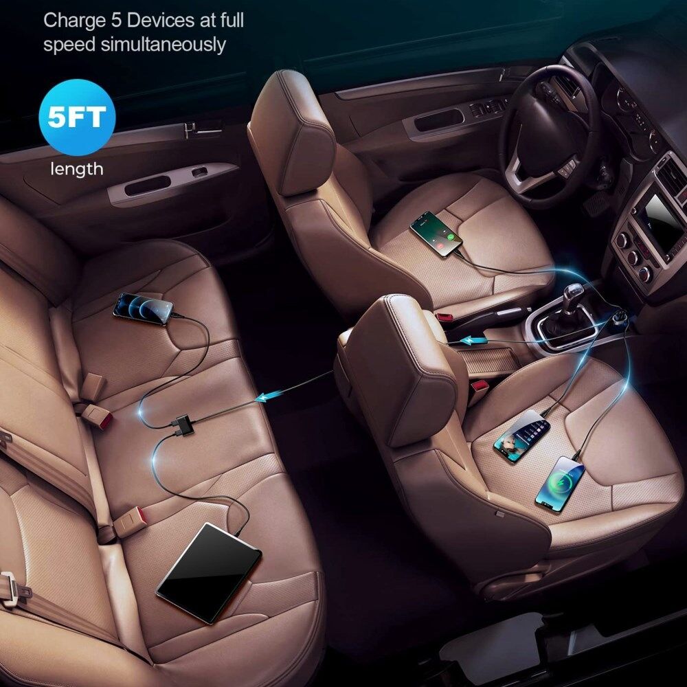 • Front and Back Seats Charge Freely: This car charger has 5 port charging ports to settle the shortage of charging