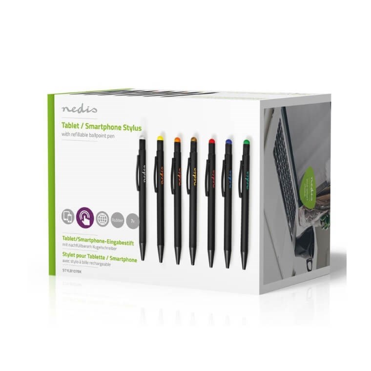 Stylus Pen voor Tablet / Smartphone - 7 st. - Rubberen knopen - Clip - Pen - Zwart De styluspen, met zijn zachte punt aan één uiteinde, is perfect voor nauwkeurige bediening van tablets en smartphones.