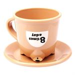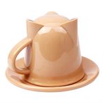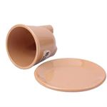Een leuke en unieke Kop met een handvat van keramiek en een bijbehorende schotel, die ook als deksel kan worden gebruikt.