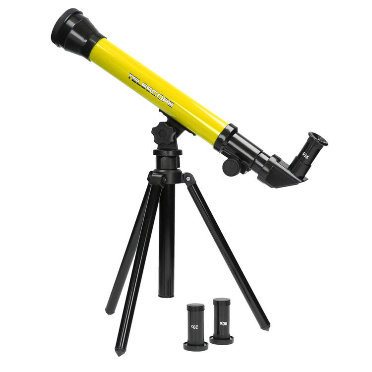 Bekijk de sterren van dichtbij met deze gele telescoop op standaard. Plaats een van de 3 verschillende opzetstukken op de telescoop en ontdek het sterrenstelsel. De telescoop heeft een 30 mm objectief en is in positie te verstellen. Zo kun je alle hoeken van het heelal zien. De telescoop is gemaakt van robuust kunststof en staat op een statief van ca. 30 cm.