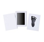 Zorg ervoor dat de inkt op de meegeleverde witte kaarten naar beneden is gericht. Druk de hand en de voet van de baby apart op het stempelkussen en laat de afdruk van de baby op de kaarten achter.