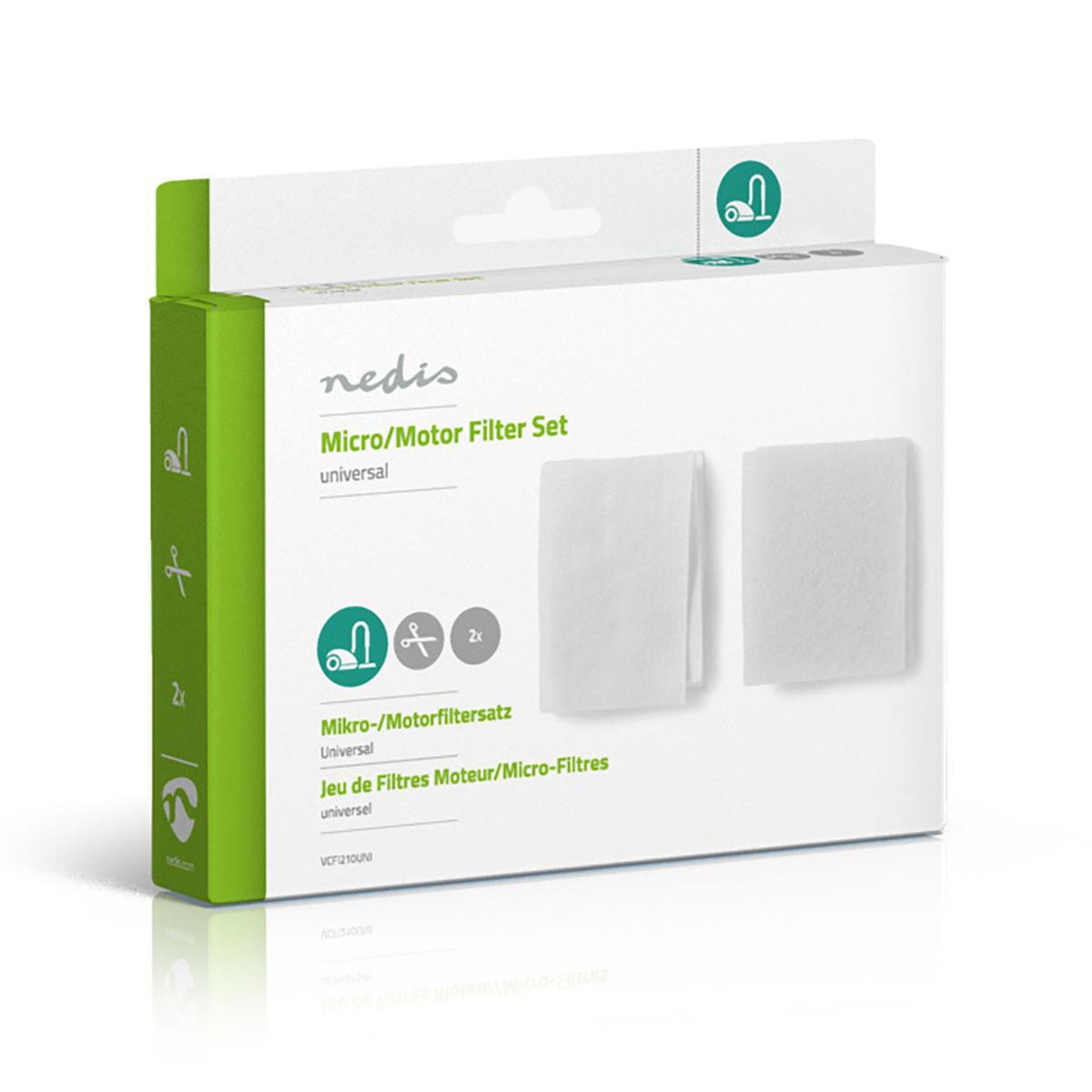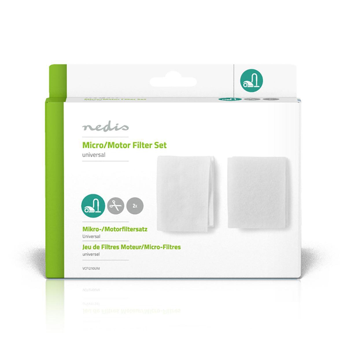 Universal filterset voor stofzuiger, bestaande uit een micro- en een motorfilter. De filters kunnen op elke maat worden gesneden, zodat ze op elk type stofzuiger kunnen worden aangepast.