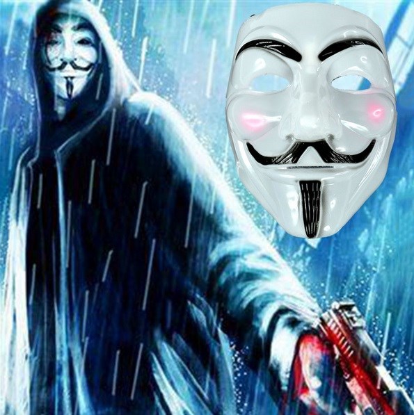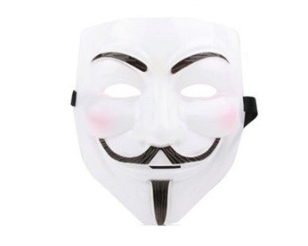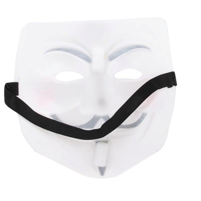 Een extreem populair anoniem masker van licht plastic met een brede elastische band.