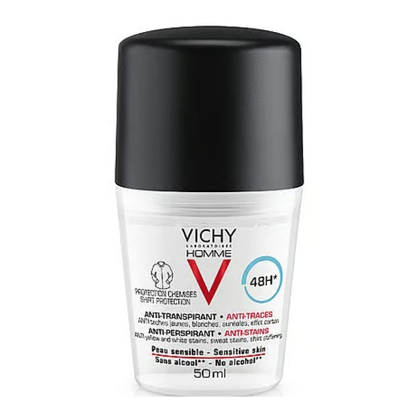 Vichy Homme Deo Shirt Protection 48T is een effectieve antiperspirant voor mannen die geen gele of witte vlekken op kleding achterlaat.