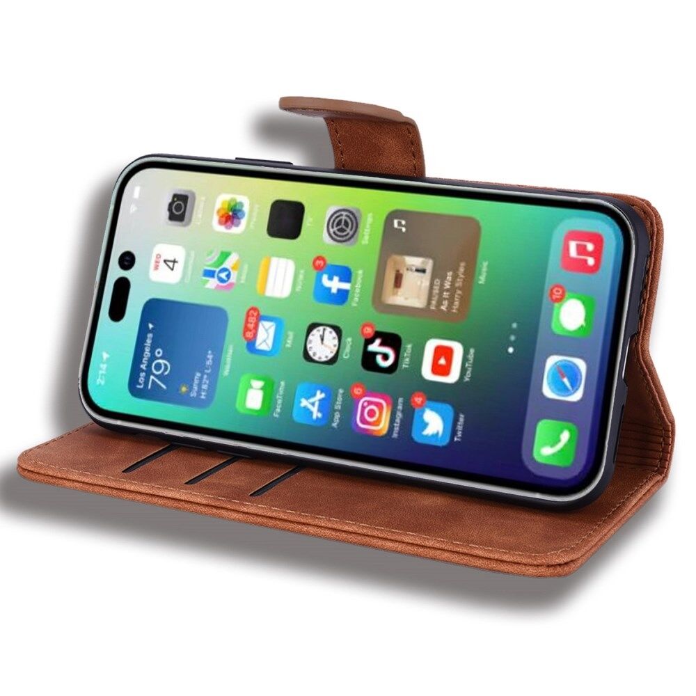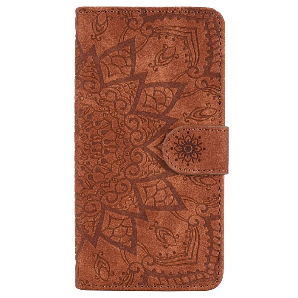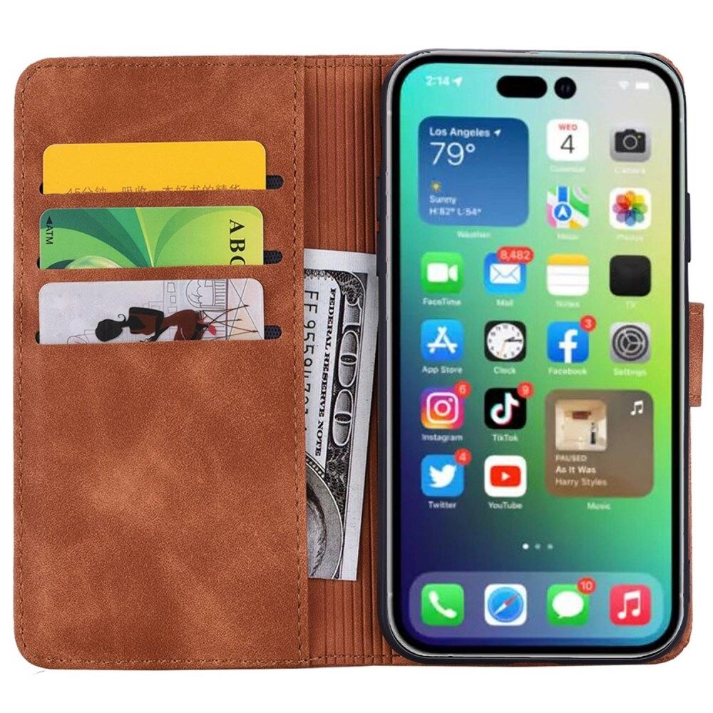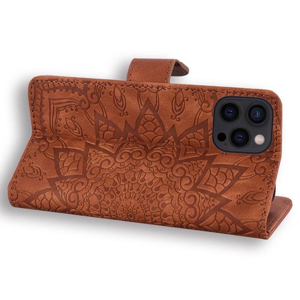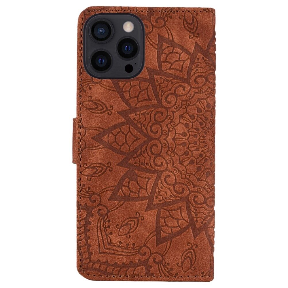 Voor iPhone 14 Pro 6.1 inch Opdruk Bloem Telefoon Flip Cover Portemonnee Ontwerp Kalf Textuur Lederen Cover met Stand - Bruin