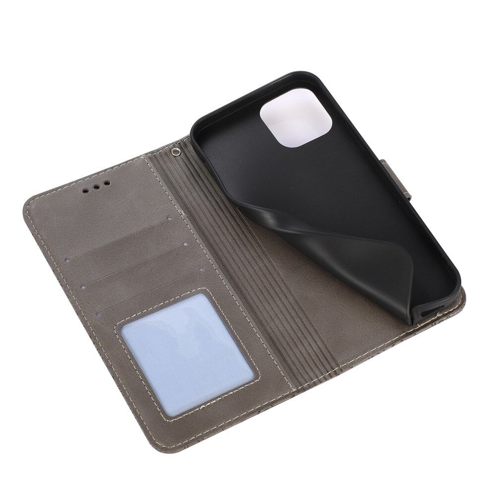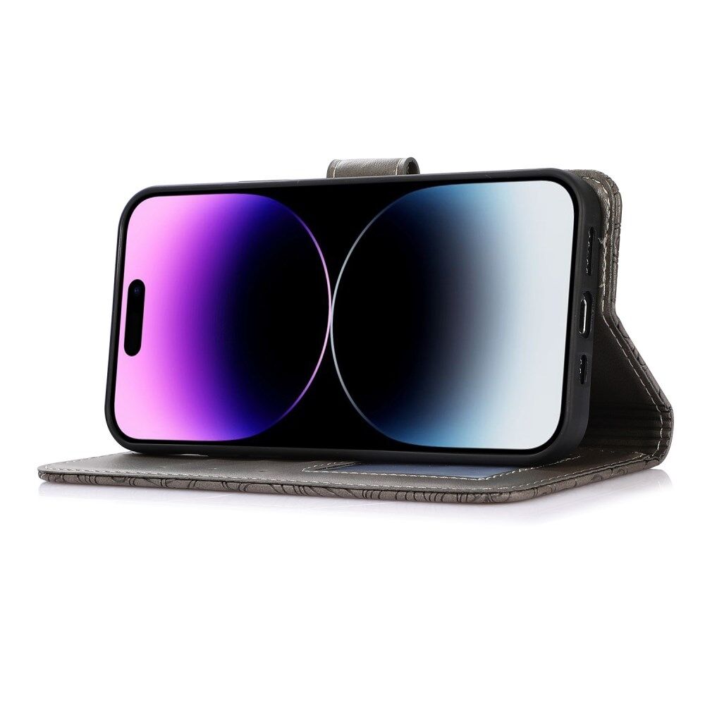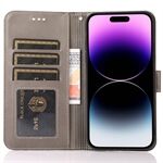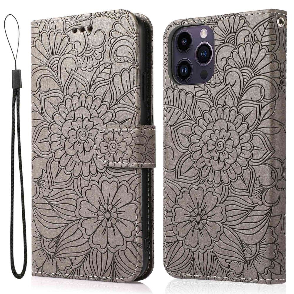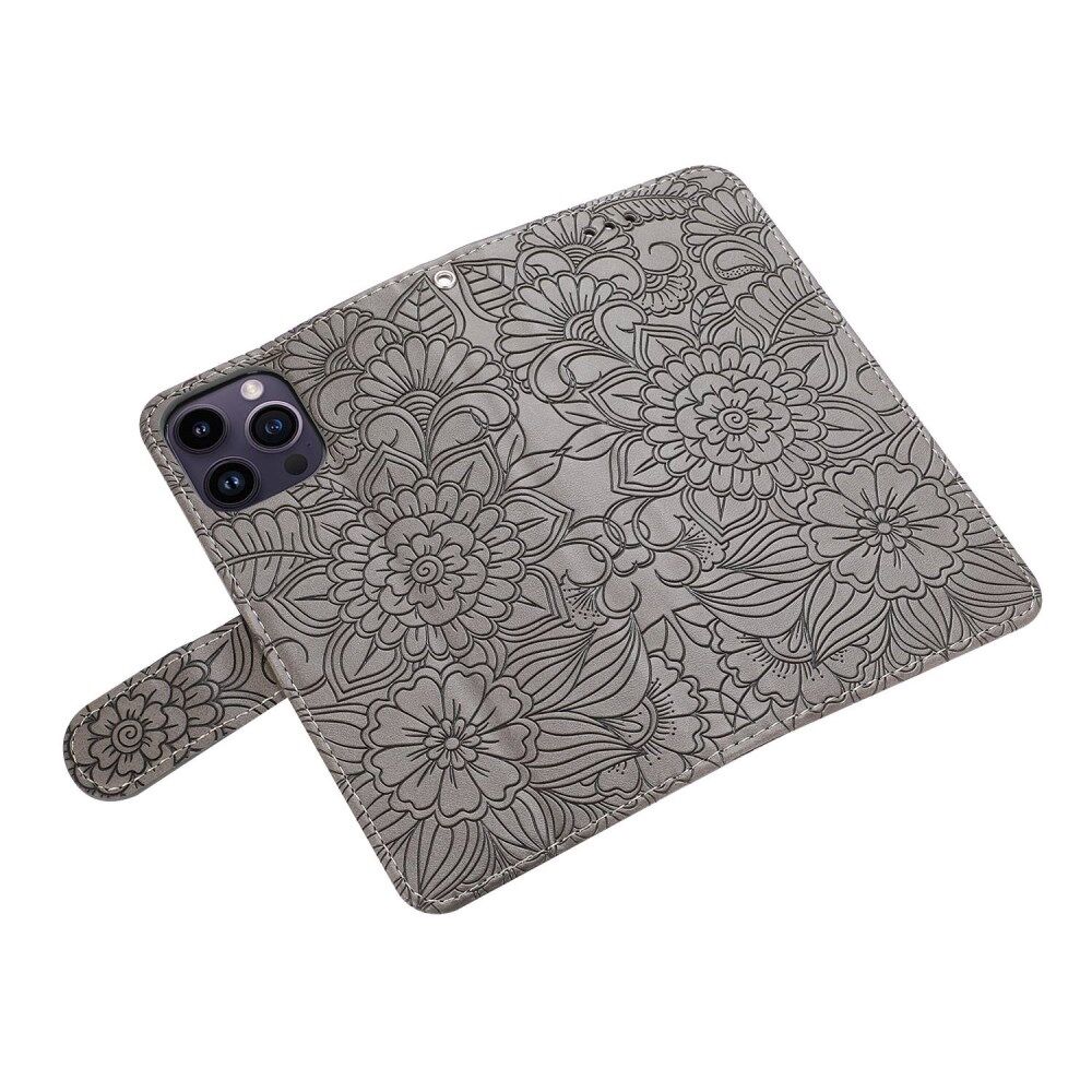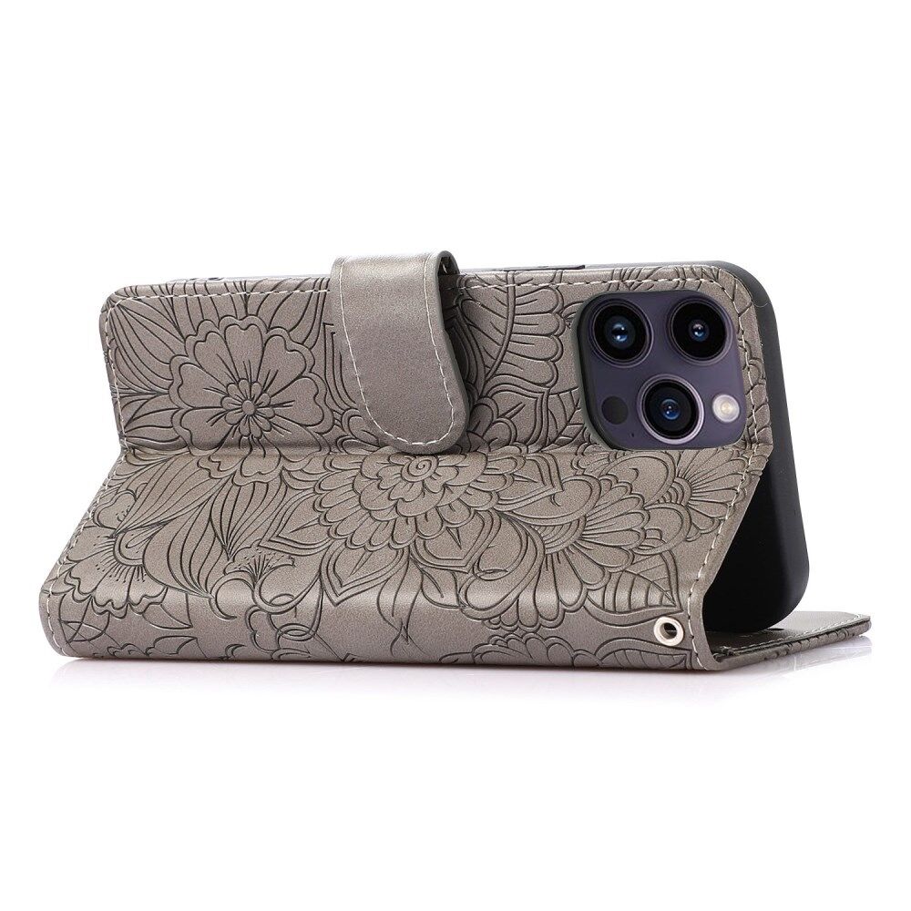 Voor iPhone 14 Pro anti- Scratch portemonnee hoesje bedrukt bloemenpatroon PU lederen Stand telefoonhoes met riem - grijs