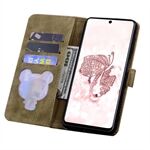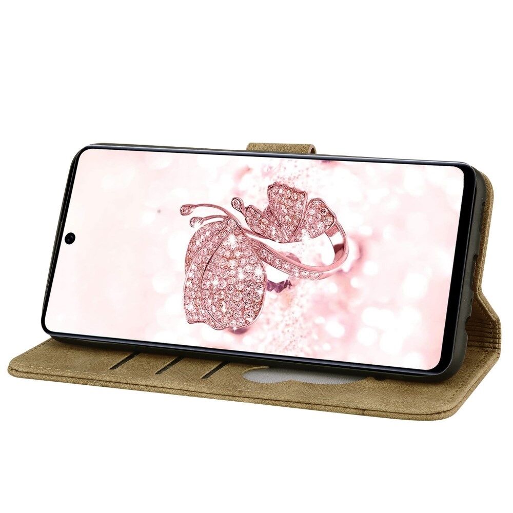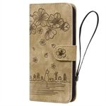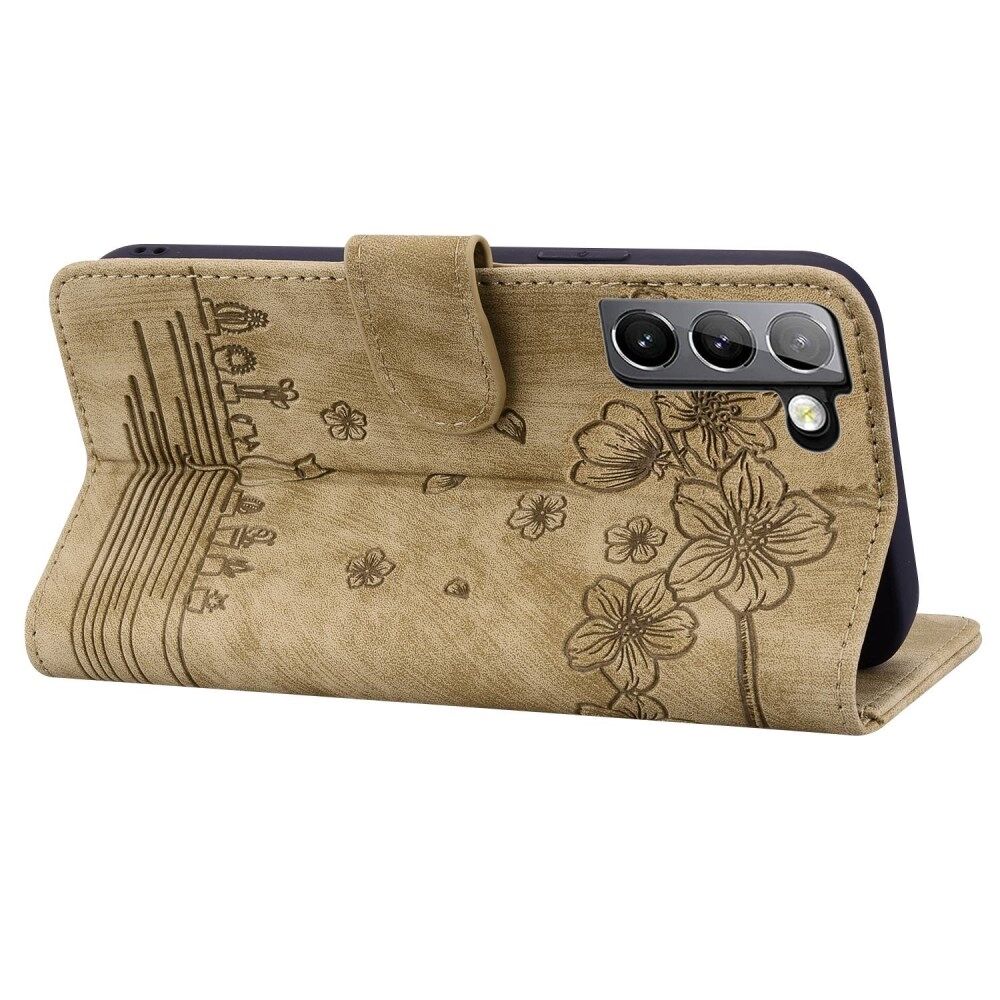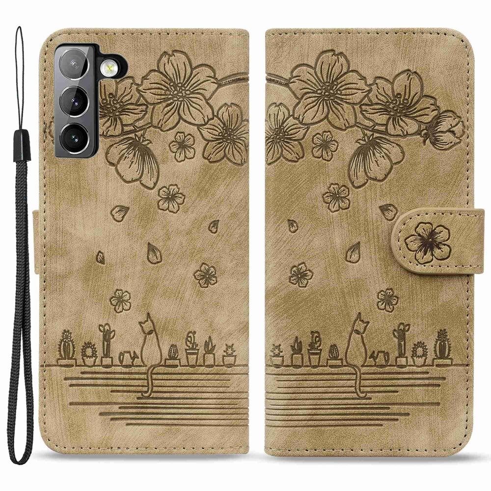 Voor Samsung Galaxy S22 5G Anti-val Scratch Telefoon Portemonnee Hoesje Kersenbloesem Kat Bedrukt PU-leer Stand Goede bescherming Mobiele telefoonhoes met riem - Bruin
