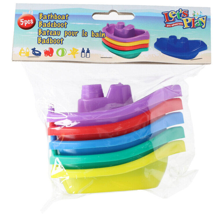 Vijf verschillend gekleurde plastic zwemboten. Koppel de boten aan elkaar en je hebt één lange rij.